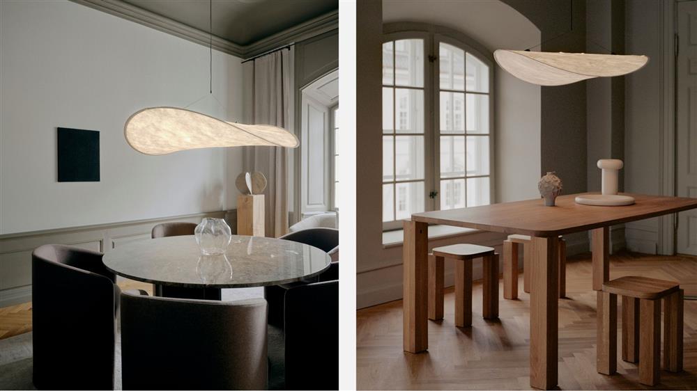 Denne lampe, der nærmest ligner en let, svævende sky, skaber et behageligt og diffust lys over spisebordet. Lampens moderne design er både blødt og stilrent, hvilket gør den til et dekorativt element, der tilfører elegance til rummet. Med en diameter på 70 cm kan lampen let blive centrum for spisestuen, og dens bæredygtige materiale gør den både praktisk og miljøvenlig. Dette er en lampe, der passer perfekt til både intime middagsselskaber og større sammenkomster.