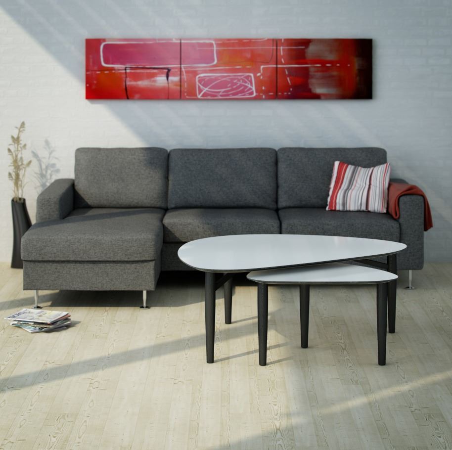 Smukt og tidsløst Katrine Trekant Sofabord fra Thomsen Furniture. Sofabordet er dansk design, der smelter sammen med gamle håndværksmæssige traditioner. Det både stilrene og minimalistiske bord kan placeres mange steder i rummet og ser fantastisk ud. Bordpladen er lavet i 19 mm sort MDF med stenlook laminat og bordben i sortlakeret egetræ. Den fleksible Katrine-sofabordserie kommer både i en stor og en lille udgave og ser yderst elegant ud som et sæt. Hvis en bordkombination ønskes anbefaler vi en højdeforskel på 5 cm mellem det laveste og det højeste bord.