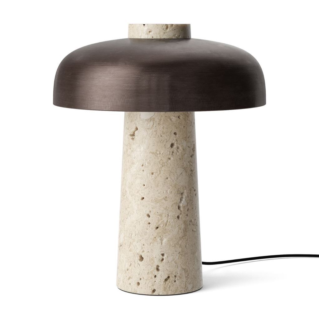 Smuk bordlampe med konisk travertinbund og bronzet anodiseret aluminiumskærm fra Audo. Den unikke sammensætning af materialerne giver lampen et råt og roligt u Se mere ...