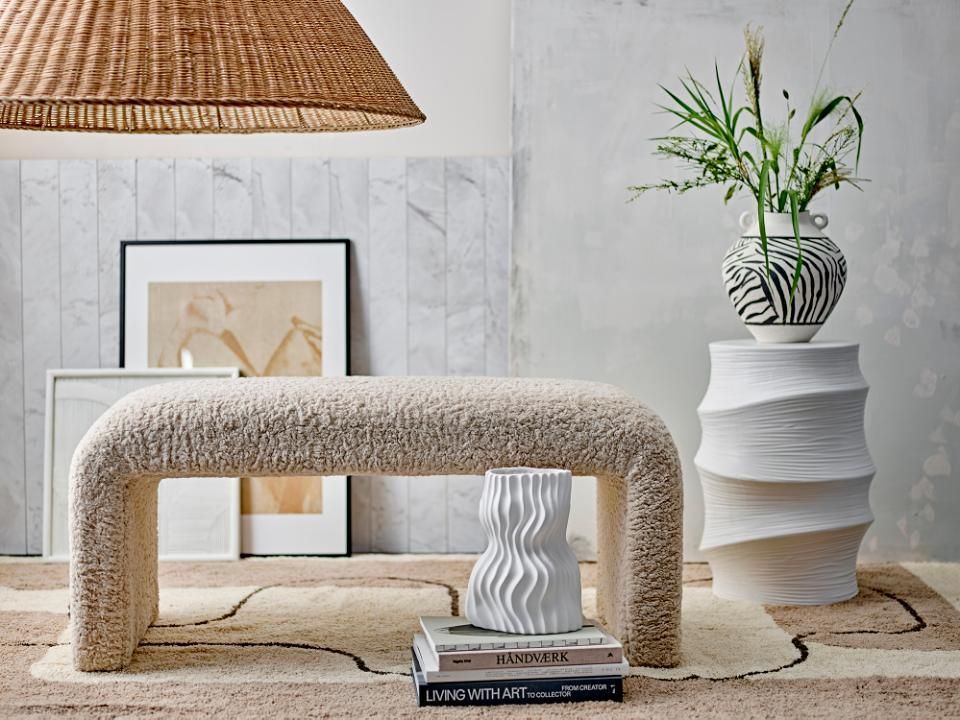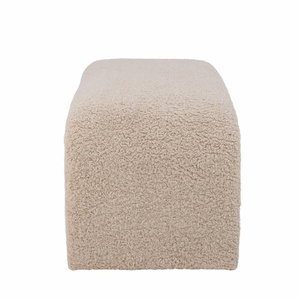 Bobbie Bænk fra Bloomingville i et lækkert og lyst bouclé-stof. Bænkens runde form og bløde kanter gør den dekorativ i sig selv. Brug både bænken som en lille siddeplads eller style den med dekoraktive elementer og puder for et personligt præg.
