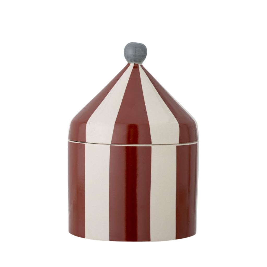 Cimmi Krukken med Låg fra Bloomingville Mini er en hyggelig opbevaringsløsning, der tilføjer leg og fantasi til ethvert barns rum. Den søde krukke er formet som et cirkustelt og lavet af stentøj med et stribet rødt og hvidt mønster. Den er perfekt til at gemme små skatte, fra slik til småt legetøj, og fungerer også som et dekorativt element på børneværelset eller i køkkenet.