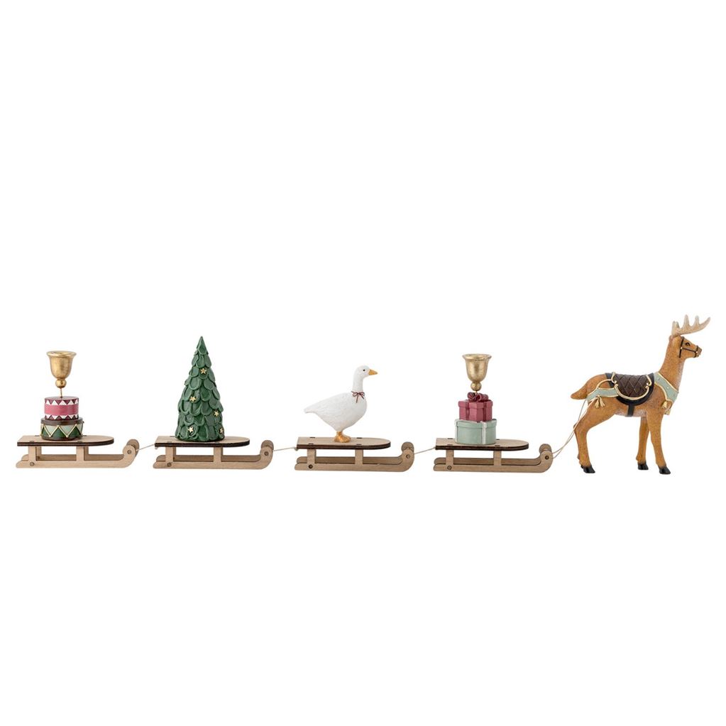 Dasher Deko fra Bloomingville er en charmerende julepynt, der viser en slæde fyldt med et juletræ, en gås og et rensdyr. Slæden er udstyret med to lysestager i en elegant guldfinish, som skaber en varm og hyggelig stemning – helt perfekt til juletiden. Figurerne er lavet af polyresin og omhyggeligt håndmalet, hvilket giver hver dekoration sit helt eget unikke udtryk