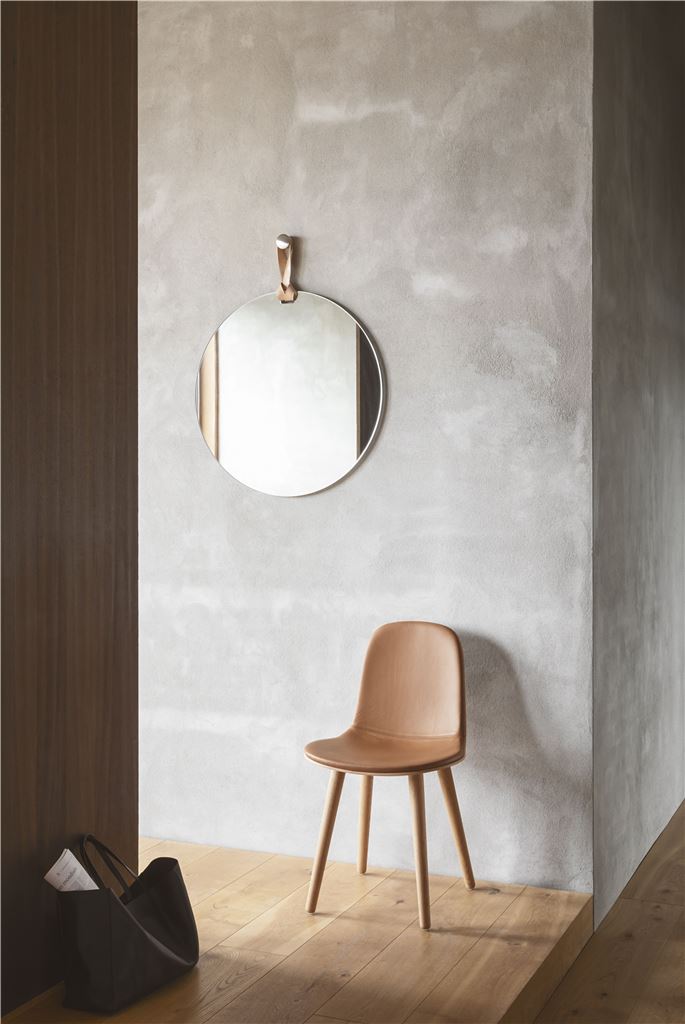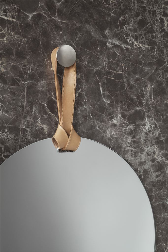 I den ene ende af spejlet er der fastbundet en strop i kernelæder, som tilfører spejlet kant.