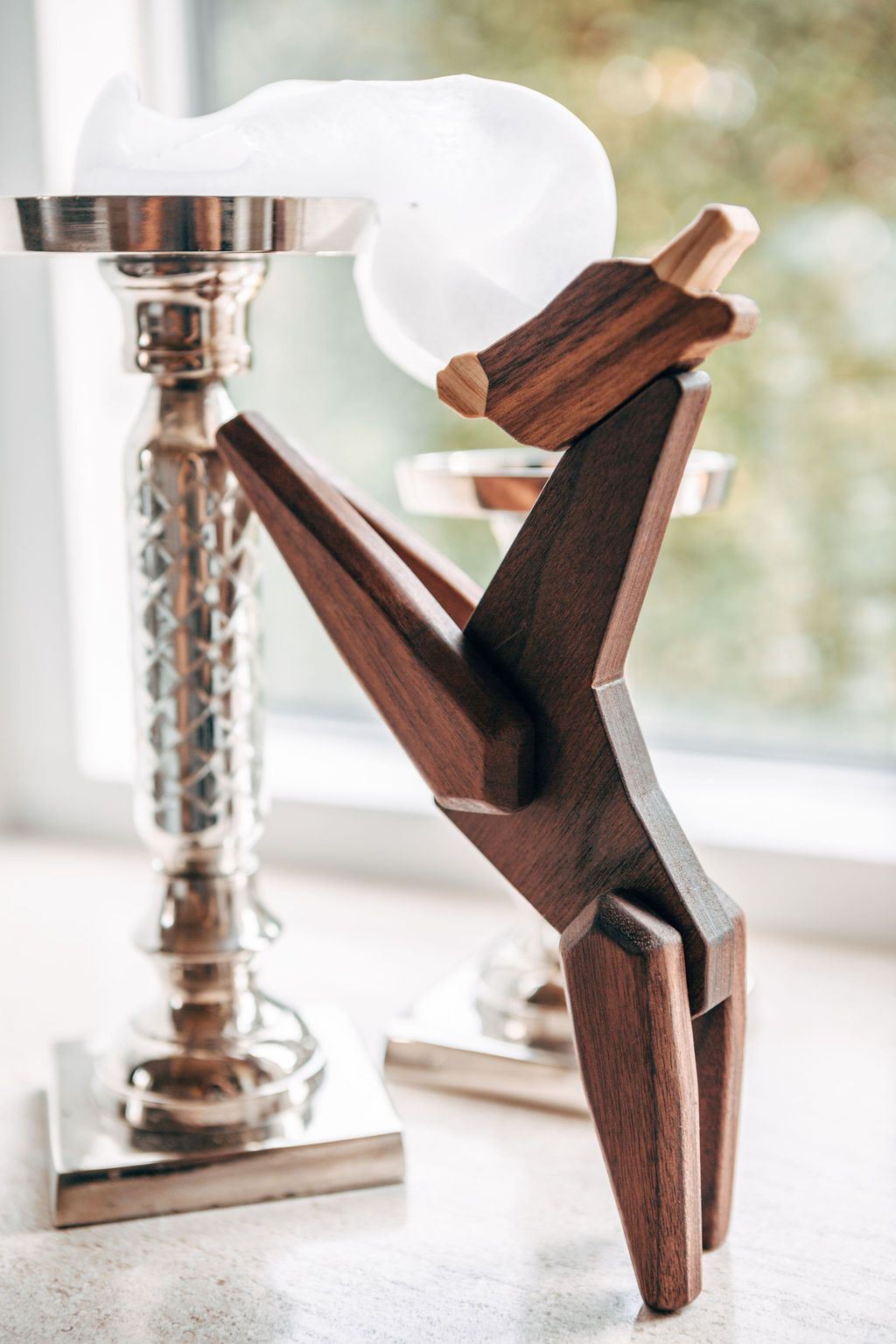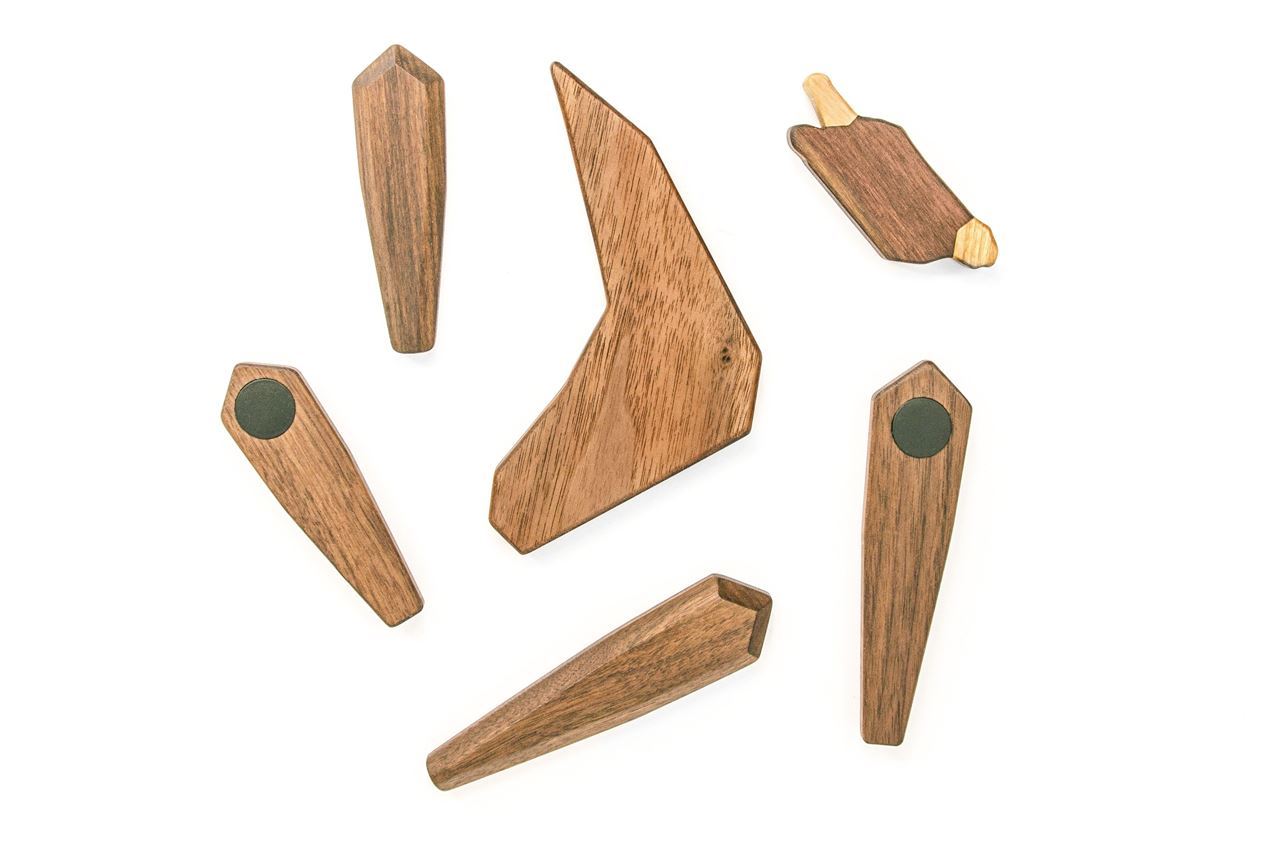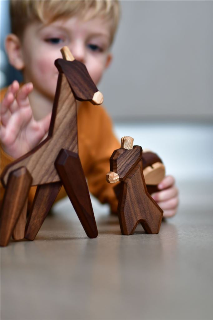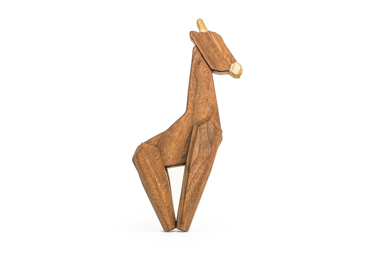 Giraffen er lavet i nordamerikansk valnød og ask. Træfigurens formgivning er enkel og udførlig på en og samme tid. Giraffen er et magnetisk samlesæt bestående af 6 dele. Træfigurens udtryk og størrelse vil passe ind i de fleste rum i hjemmet, og kan nemt pynte i vinduet, på reolen eller hylden.