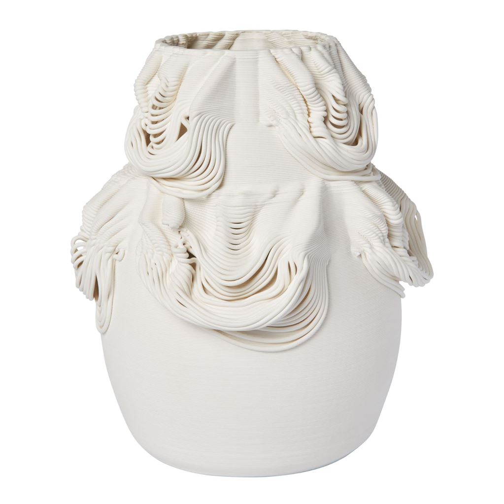 Drisca Vasen kombinerer en klassisk silhuet med moderne 3D-printet keramik og fremstår som et elegant eksempel på nytænkende håndværk. Den matte, uglaserede overflade understreger materialets taktile karakter, mens de båndlignende mønstre giver indtryk af tekstil i bevægelse. Vasen er ideel til tørrede blomster eller som et dekorativt statement i sig selv og tilfører et skulpturelt præg til hylder, konsoller eller piedestaler.