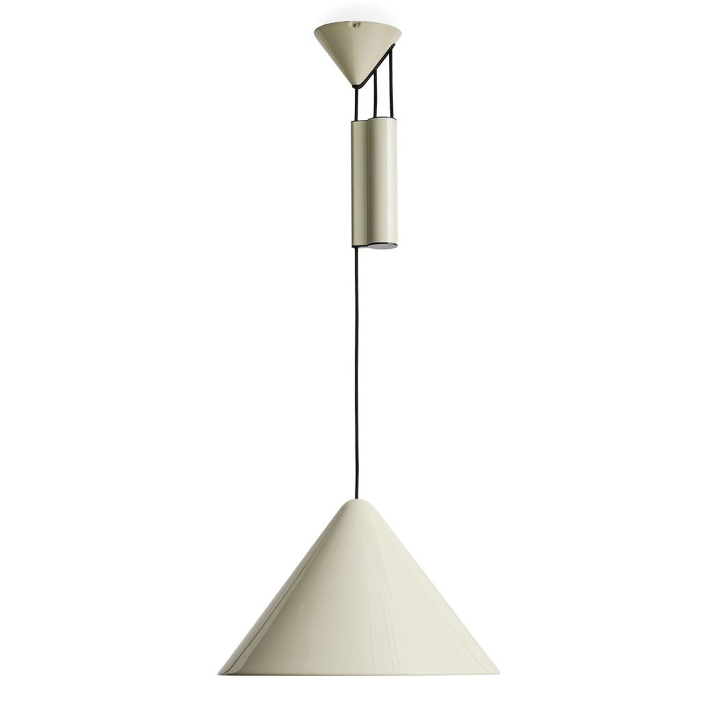 Lampens design tager udgangspunkt i en skråt formet, konisk skærm, der hænger enkelt og elegant fra loftet. Denne højdejusterbare udgave, gør det muligt at tilpasse lyset præcist efter behov – ideelt over spisebordet, hvor lampen nemt kan skifte mellem arbejdslys og hyggelig belysning til fællesspisning.