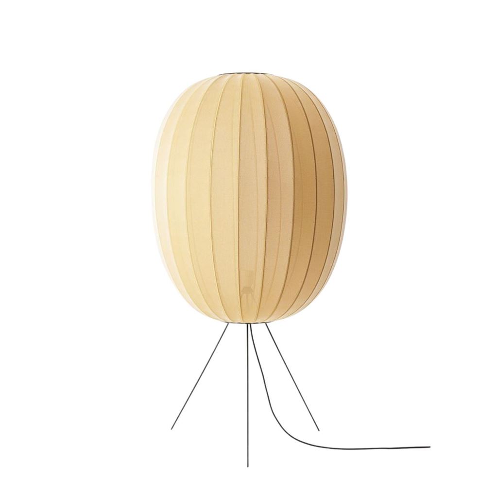 Knit-Wit High Oval gulvlampen fra Made By Hand er en dekorativ og karakteristisk gulvlampe, der er inspireret af den klassiske rispapirslampe. Men i stedet for rispapir, har man brugt det gamle håndværk, strik, til fremstilling af lampen. Lyskilden er skjult og vil skinne ud gennem lampeskærmens smukke mønster, hvor lyset bliver fordelt og giver et behageligt og stemningsfuldt lys i rummet. Lampens 3 tynde, sort ben giver en flot kontrast til den bløde skærm, hvilket givet et elegant og stilfuldt udtryk i indretningen.