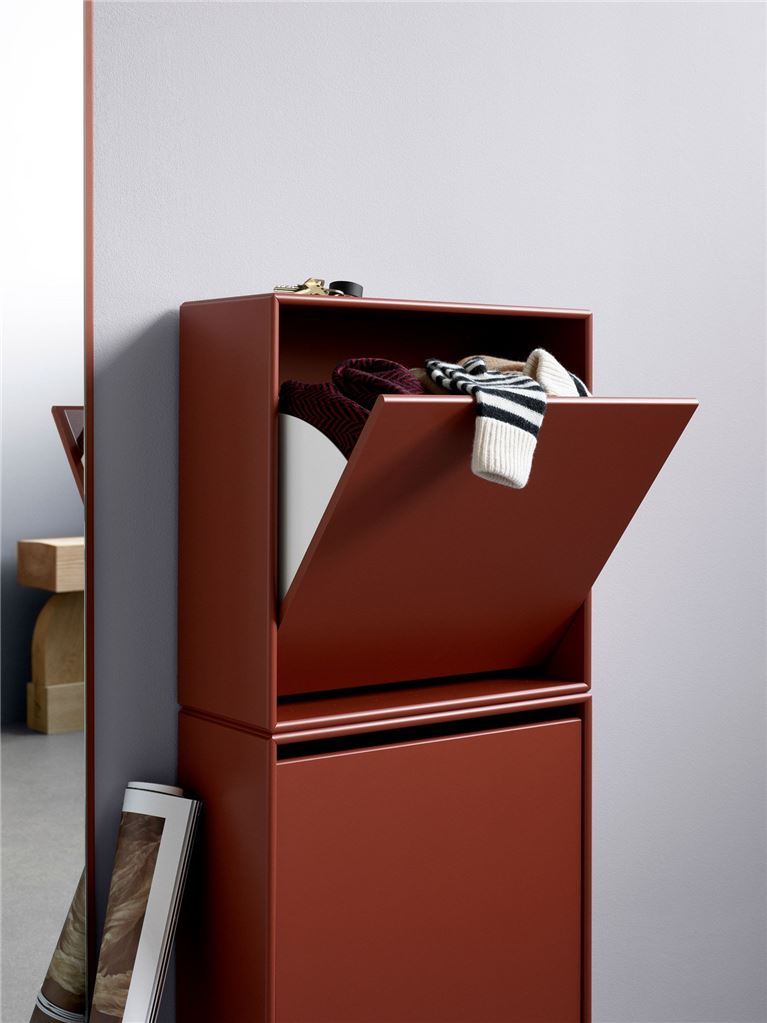 Fint og praktisk skoskab fra Montana, designet af Peter J. Lassen. Skoskabet er en del af Montanas Hall serie, som består af flere stilrene og ikke mindst funktionelle elementer, der nemt kan kombineres og tilpasses efter det enkelte behov. Det lette og slanke design gør skoskabet ideelt til den mindre entré, hvor funktionalitet er i fokus. Gem sko, vanter, huer og diverse andre accessoires væk og gør entréen nydelig til når du eller dine gæster går ind af døren til entréen. I de fleste tilfælde er entréen det rum i hjemmet der ses først, hvorfor lige nøjagtigt dette rum prioriteres højt. Entréen skal gerne have en personlig indretning, som ikke mindst følger den røde tråd i resten af hjemmet. Montana skoskabet er perfekt til at skabe et personligt udtryk, da farvemulighederne på de lakerede fronter er mange, samtidigt med at du kan tilføje tilbehør efter din smag. Skabet består af en vippeskuffe og en indvendig plastikmåtte, som beskytter selve skoskabet for snavs og ridser, hvilket medvirker til at netop dette skoskab fremstår pænt og nydeligt i mange år ud i fremtiden. Skabet er 20 cm i dybden, hvilket giver plads til 2-3 par sko.