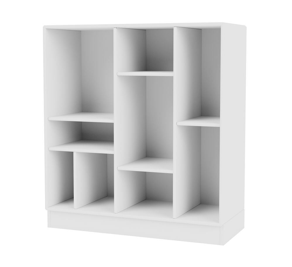 Skøn reol med ben fra Montana. Denne reol har ni åbne rum i varierende størrelser, hvilket gør den til en yderst alsidig opbevaringsløsning til eksempelvis stuen. Brug den til at opbevare bøger, vaser, planter og andre dekorative ting og sager, som pynter i indretningen. På børneværelset er den fine reol perfekt til at rumme eksempelvis tøjdyr, farveblyanter og børnenes kreationer. Afhængigt af monteringsløsningen på reolen kan tingene enten pynte i en sikker højde, således at reolens indhold er uden for børns rækkevidde, eller reolen kan monteres lavt, således at tingene er let tilgængelige for barnet. Med Montanas modulsystem er mulighederne mange, og der er derfor rig mulighed for at sætte sit personlige præg på sit opbevaringsmøbel gennem farvevalg og utallige kombinationsmuligheder.