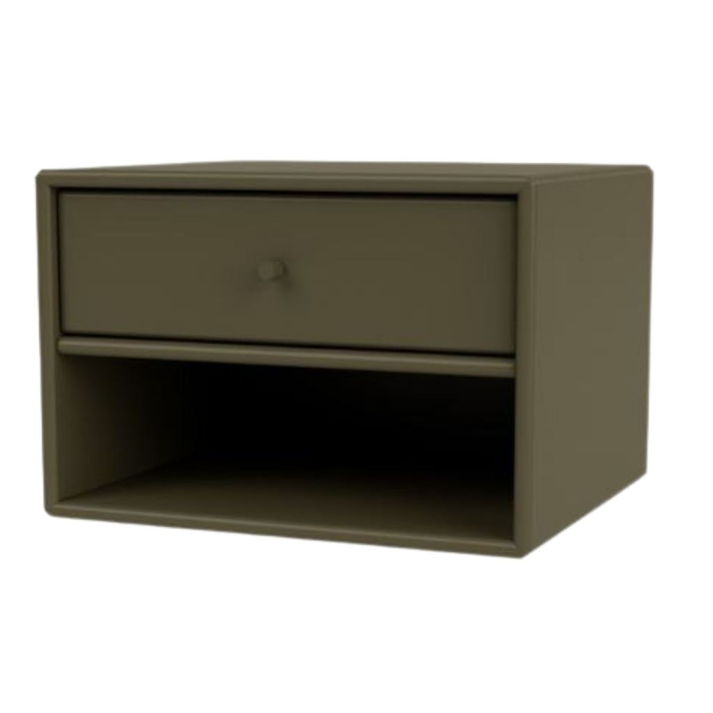Smukt sengebord med ophængsbeslag fra Montana. Med det fine lille sengebord kan du opbevare dine vigtigste ting til natten i den medfølgende skuffe samt prakti