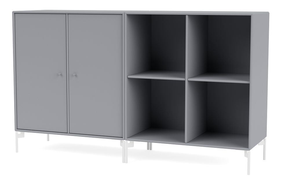 Skøn og alsidig skænk med ben fra Montana. Denne fine skænk har et rummeligt skabsmodul samt et hyldemodul bestående af fire rum, og det er derfor en perfekt opbevaringsløsning, hvis du både ønsker at udstille dine yndlingsting på hylderne såvel som at gemme ting væk i skabene. Brug skænken i stuen, entréen eller hjemmekontoret til at opbevare eksempelvis bøger, magasiner, kontorartikler eller noget helt fjerde. Skænkens skarpe og rene linjer, gør, at det ikke alene er et funktionelt og praktisk opbevaringsmøbel, men også et minimalistisk element, som vil tilføre en smuk detalje i ethvert hjem. Skænken er sammensat af to reolmoduler, og det er derfor muligt at anvende modulerne som individuelle reoler, hvis opbevaringsbehovet forandrer sig, eller hvis man blot ønsker fornyelse i hjemmet.
