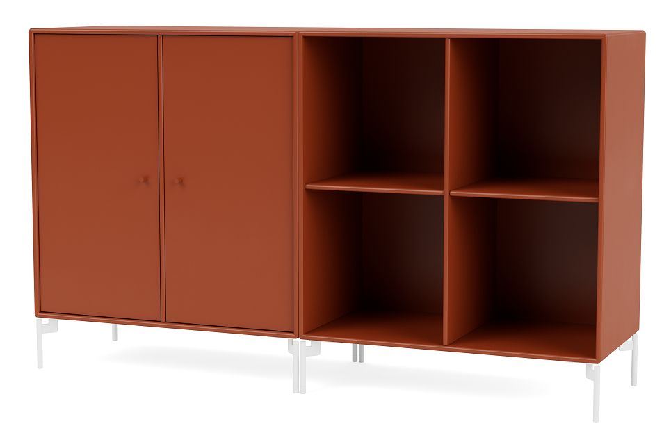 Skøn og alsidig skænk med ben fra Montana. Denne fine skænk har et rummeligt skabsmodul samt et hyldemodul bestående af fire rum, og det er derfor en perfekt opbevaringsløsning, hvis du både ønsker at udstille dine yndlingsting på hylderne såvel som at gemme ting væk i skabene. Brug skænken i stuen, entréen eller hjemmekontoret til at opbevare eksempelvis bøger, magasiner, kontorartikler eller noget helt fjerde. Skænkens skarpe og rene linjer, gør, at det ikke alene er et funktionelt og praktisk opbevaringsmøbel, men også et minimalistisk element, som vil tilføre en smuk detalje i ethvert hjem. Skænken er sammensat af to reolmoduler, og det er derfor muligt at anvende modulerne som individuelle reoler, hvis opbevaringsbehovet forandrer sig, eller hvis man blot ønsker fornyelse i hjemmet.