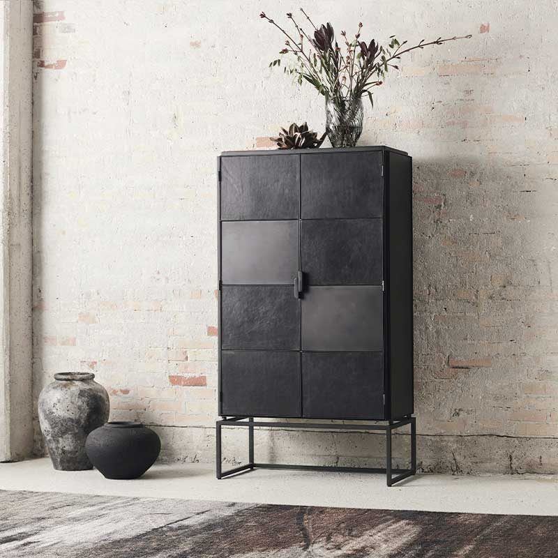 Det rustikke Austin højskab fra MUUBS er designet af Birgitte Rømer og Nicklas Lohmann og har et råt, maskulint look. Skabet er elegant, smukt og har rene linjer, Austin er fremstillet af jern og okselæder. Toppen og dele af lågerne er beklædt med læderet, lågerne har en let lukkefunktion med magneter og bag lågerne har skabet fire hylder som er klar til at opbevare dine ting. Brug skabet for eksempel til dit service, dine bøger eller andre ting du gerne vil gemme lidt af vejen. Læderet vil med tiden få patina.