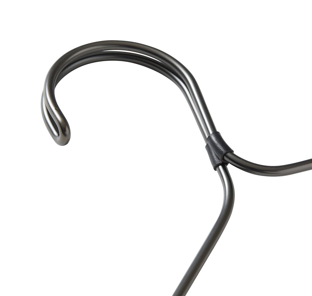 Tøjbøjler i jern fra Muubs. Bøjlerne er bukket i et stykke rundt jern, og har i toppen af krogen en fin detalje, hvor jernet er bukket dobbelt og et lille læderstykke er sat på. Bøjlerne egner sig godt til at hænge dit tøj eller overtøj på i entréen, soveværelset eller i garderobeskabet.