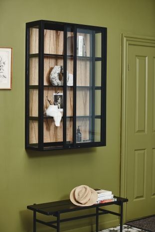 Smukt, mahogni vægskab fra Nordal med to glasdøre. Bag glasset på vægskabet anes bagsiden af træ, som giver et utroligt smukt og unikt udtryk. Hæng skabet i Se mere ...