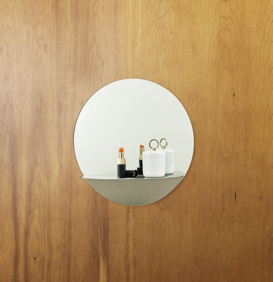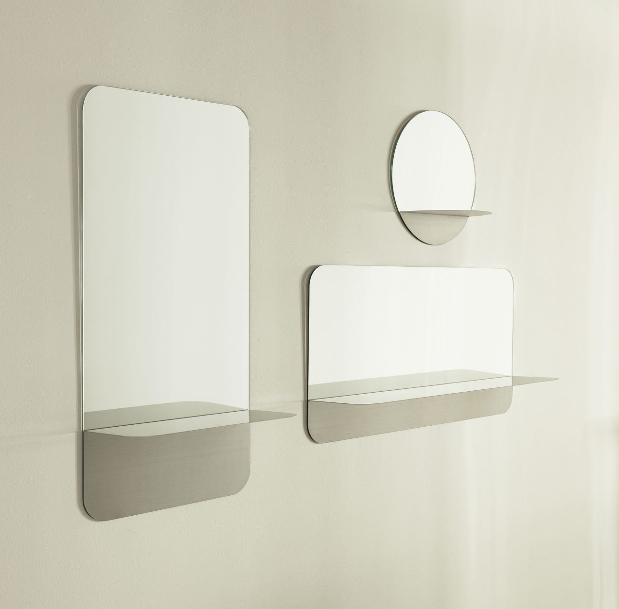 Smukt vægspejl fra Normann Copenhagen. Horizon vægspejle er en serie med spejle i geometriske former, hvor der i designet er integreret en stålhylde. Hylden giver en praktisk afsætningsplads og skaber samtidig også muligheden for en smuk visuel effekt.