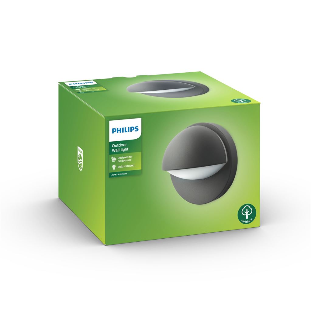PHILIPS June væglampen er en udendørs lampe der er lavet i aluminium. Lampens simple udtryk betyder at den er alsidig og kan placeres mange forskellige steder rundt omkring på huset og i sammensætning med diverse materialer og farver. Lampen er egnet til udendørs brug og kan derfor holde til al slags vejr.