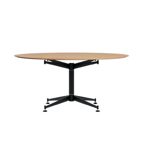 Bordets funktionelle, firehjørnet stel hviler på justérbare fødder, som nemt kan hæves eller sænkes til de højdevarierende stole eller det ujævne gulv.