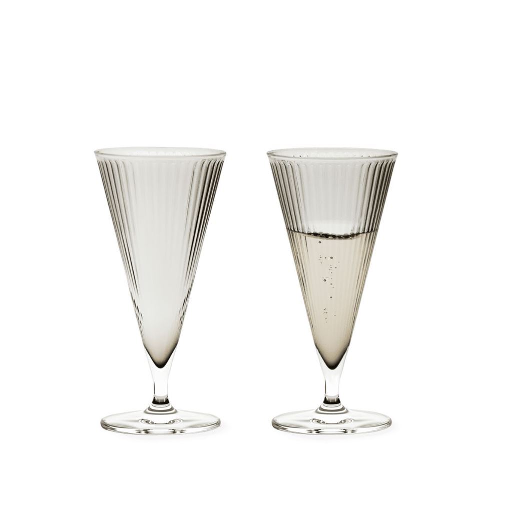 Champagneglassene måler 18 cm i højden og er designet med tydelige referencer til Rosendahls ikoniske Grand Cru-univers. Den skulpturelle, koniske form – inspireret af den klassiske vinprop – kombineres med de velkendte, gentagne riller, som er en fast del af Grand Cru-seriens DNA. I Nouveau-fortolkningen præsenteres rillerne med et nutidigt twist, der giver glassene et minimalistisk, men levende udtryk, hvor lyset brydes i smukke optiske reflekser gennem den røgfarvede glasmasse.