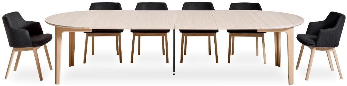 Skovbys flotte runde bord, som kan få en længde på hele 330 cm og rumme op til 12-14 personer. To matchende tillægsplader medfølger og der kan tilkøbes 2 ekstra.
