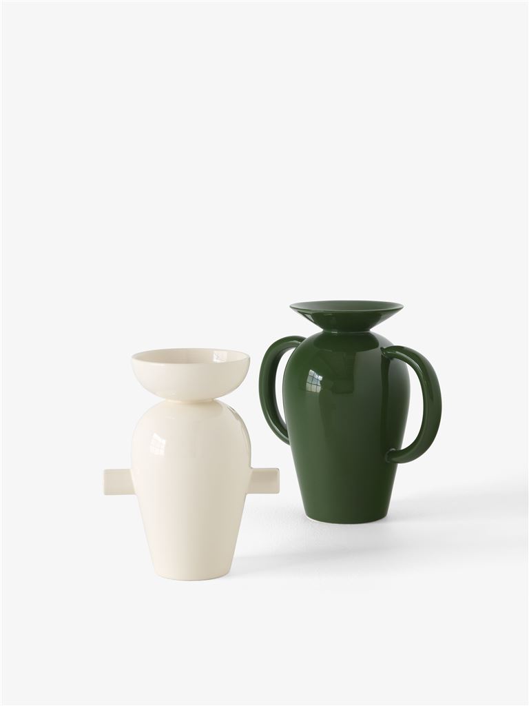 De skulpturelle former på hver Momento Vase kan ofte identificeres i Hayons malerier, de to særskilte værker udviser en stærk og legende grafisk identitet. Begge lige ikoniske i formen, JH40 kommer i en blød creme, mens JH41 fås i en fed smaragdgrøn – to nuancer valgt for deres alsidighed og forhold til floraens friske farver. Det slanke halsdesign på Momento-vaserne tjener et formål ud over æstetik alene, og kræver, at brugerne er selektive, når de placerer blomster i kammeret, hvilket tilskynder til et øjebliks opmærksomhed, mens de konstruerer en buket.