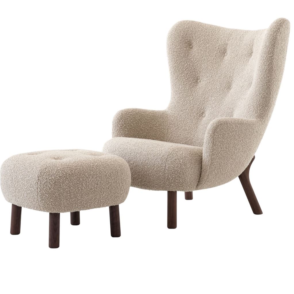 Baseret på et originalt design af den danske designer Viggo Boesen fra 1938 er Petra en loungestol og matchende skammel, der forener tidløs elegance med uovertruffen komfort. Med sin høje, vingeformede ryg og bløde, omsluttende former indbyder stolen til ro og fordybelse, mens skamlen fuldender oplevelsen med et harmonisk og afbalanceret udtryk.