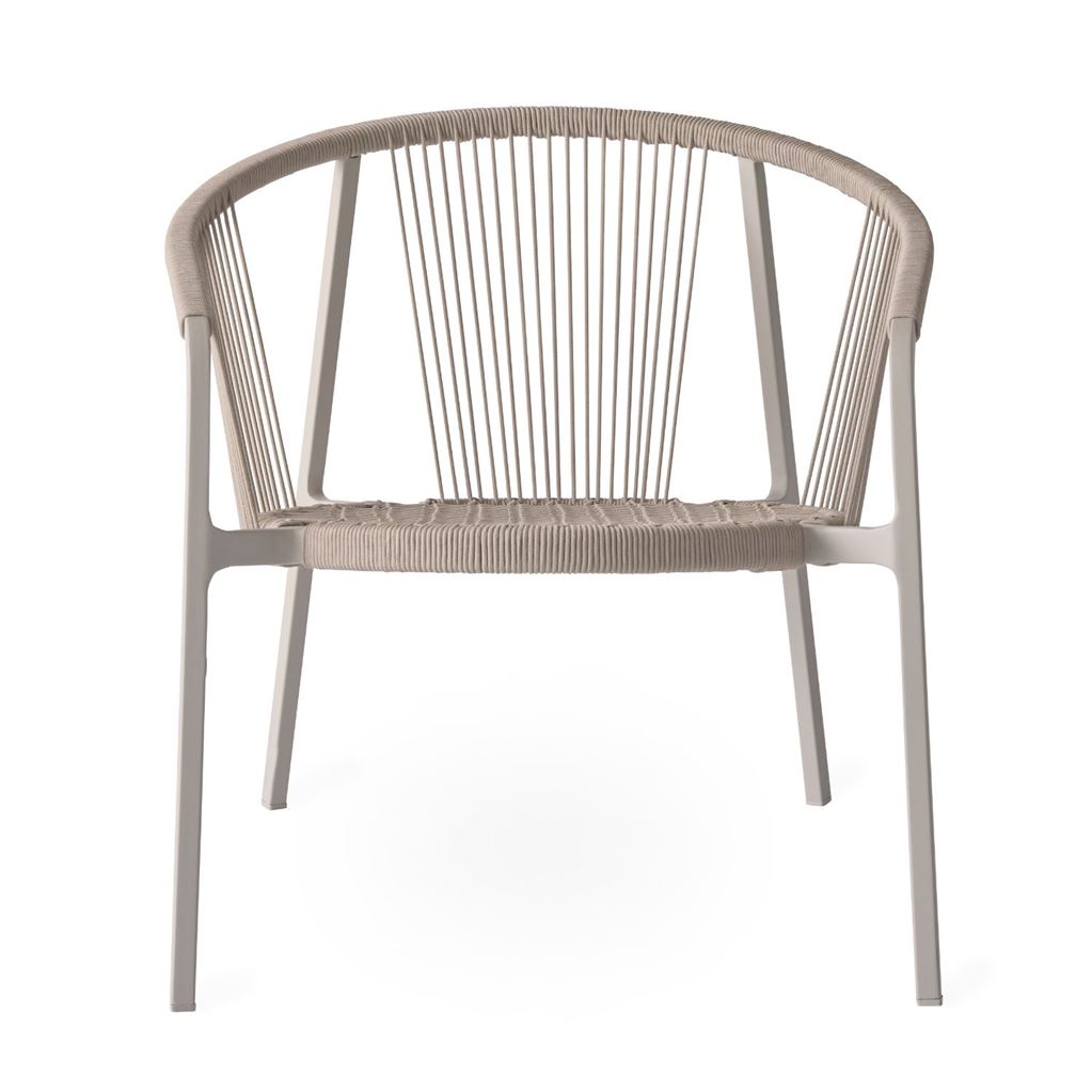 Den lave Lagrasse loungestol har en enkel pulverlakeret aluminiumsramme med et rundet ryglæn, der elegant flyder over i de brede armlæn. Flettede snore omkring ryglænet og armlænene fremhæver det lette og luftige design, som er kendetegnende for Lagrasse-kollektionen.