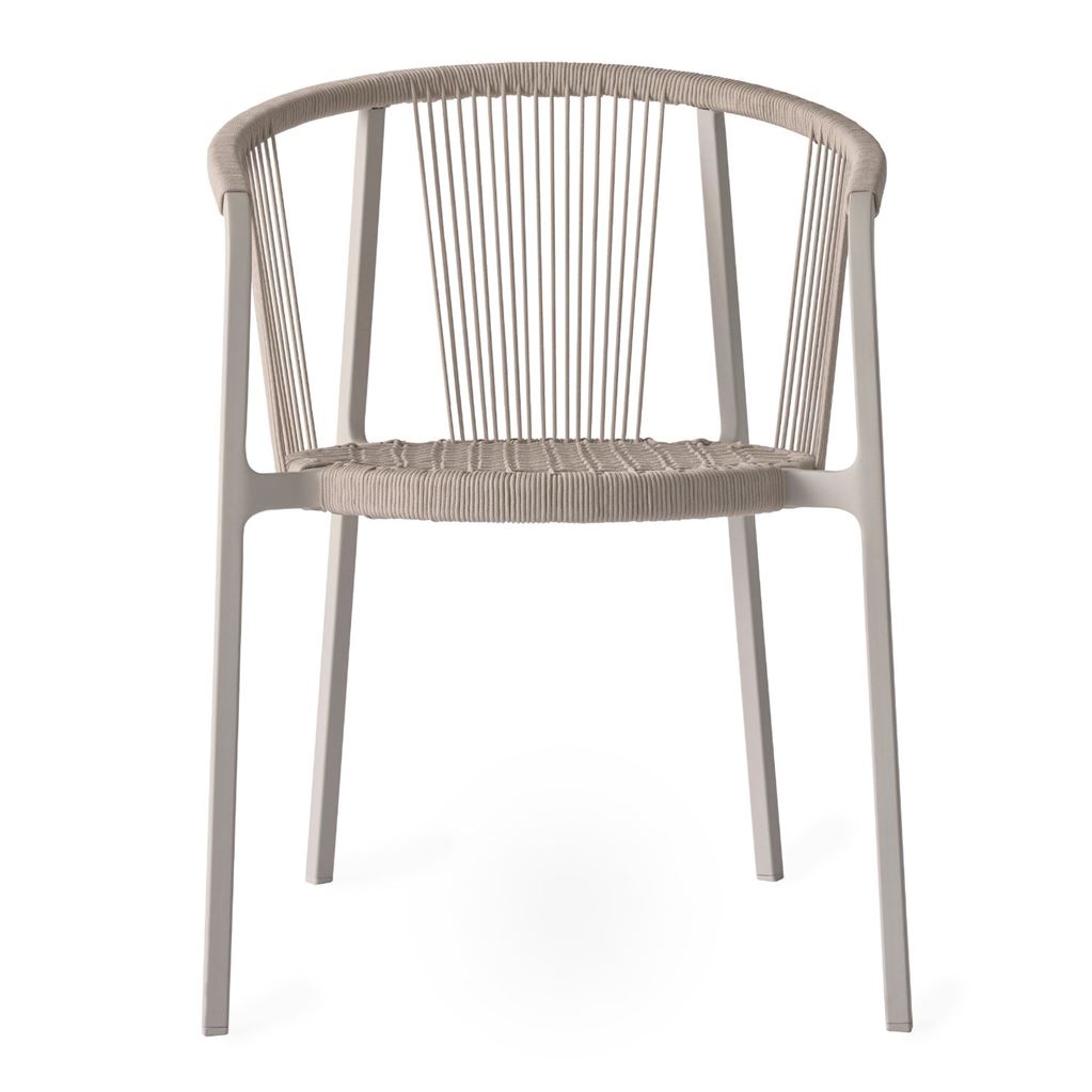 Den stabelbare Lagrasse snorstol har en enkel pulverlakeret aluminiumsramme med et rundt ryglæn, der glider naturligt over i armlænene. Flettede snore omkring ryglænet og armlænene understreger det lette og luftige udtryk, som kendetegner Lagrasse-kollektionen.