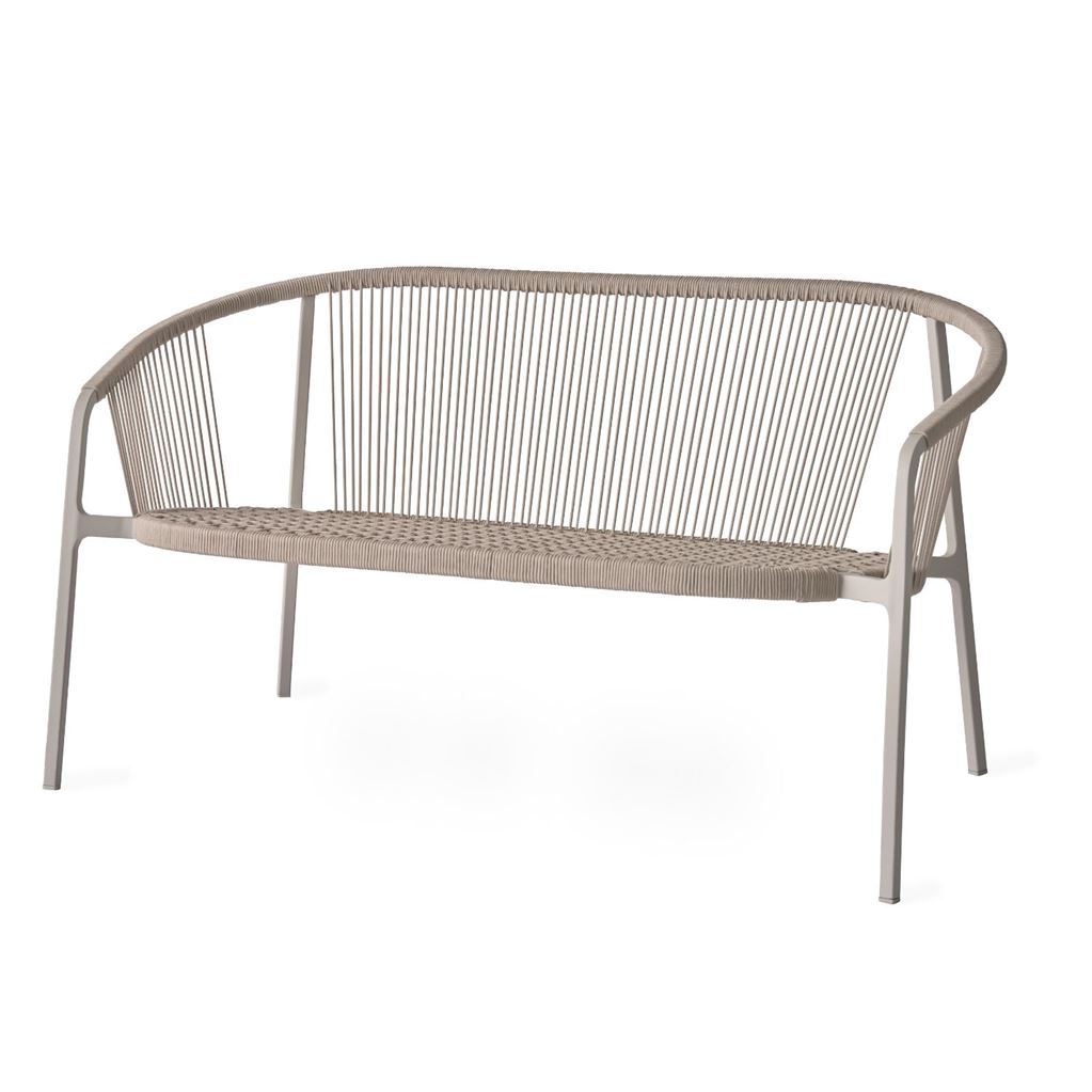 Den lave Lagrasse-to-personers sofa har en enkel pulverlakeret aluminiumsramme med et elegant buet ryglæn, der fortsætter naturligt over i brede, komfortable armlæn. Flettede snore omkring ryglænet og armlænene fremhæver det lette og luftige design, som er karakteristisk for Lagrasse-kollektionen, og giver sofaen et raffineret og indbydende udtryk.