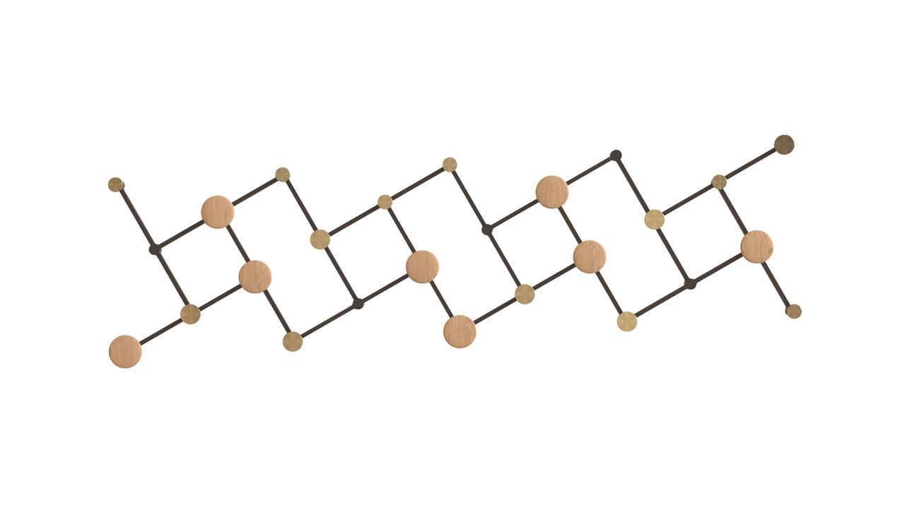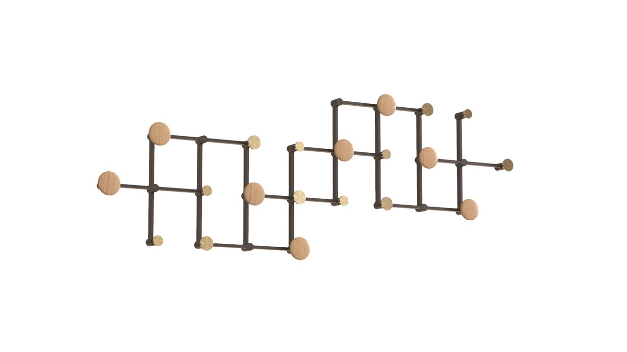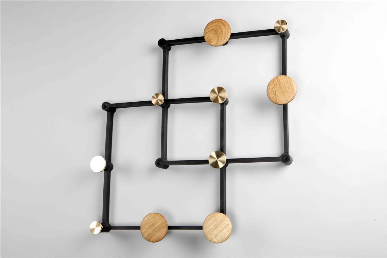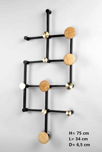 Ved køb af denne knagerække får du et samlesæt bestående af 8 sorte arme lavet i genbrugsplast, 4 træknopper lavet i eg, samt 6 messingknopper som kommer i to forskellige størrelser. På den måde sammensætter du selv din knagerække præcis som du ønsker, og som passer perfekt ind hjemme hos dig. Du har derfor mulighed for at personliggøre knagerækken.