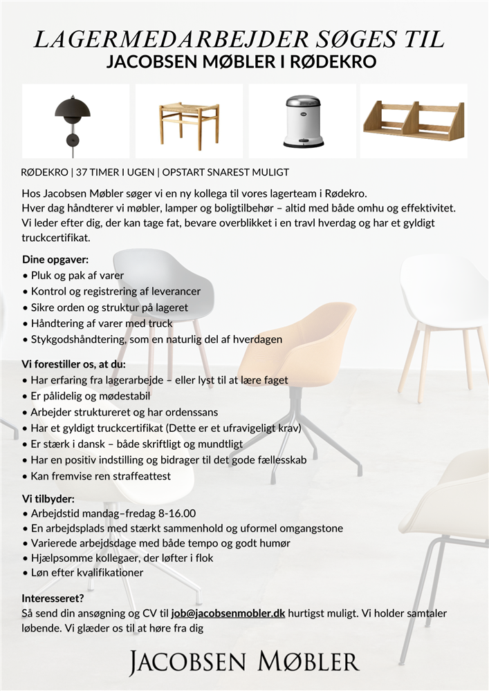 Da vores lagermedarbejder flytter til Århus, søger vi en ny kollega til vores lager i Rødekro. Hos Jacobsen Møbler håndterer vi dagligt møbler, lamper og boligtilbehør med både omhu og effektivitet, og vi leder efter en medarbejder, der kan tage fat, bevare overblikket og trives i en travl hverdag. Stillingen er på 37 timer med opstart snarest muligt