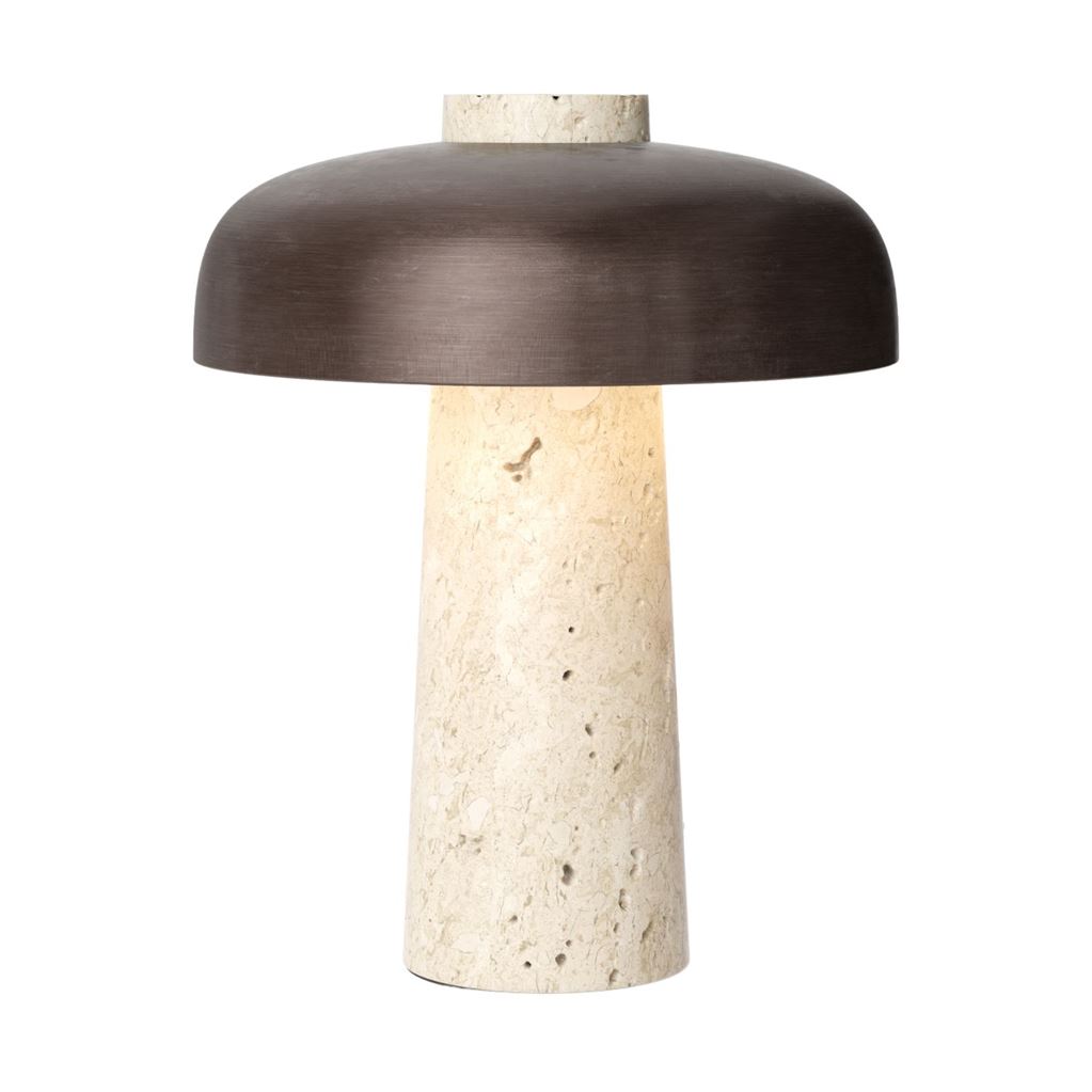 Smuk bordlampe med konisk travertinbund og bronzet anodiseret aluminiumskærm fra Audo. Den unikke sammensætning af materialerne giver lampen et råt og roligt udtryk. Lyset falder jævnt over den ubearbejdede sten og giver et spændende farvespil. På det sted, hvor skyggen og basen mødes, sidder en lysdæmperafbryder til justering af lysintensiteten. Reverse lampen, der er udstyret med en svag til varm LED-lyskilde, kaster varmt lys på et natbord eller kommode, hvilket gør den til en elegant og karakteristisk løsning til en lang række lysbehov. Der er lysdæmperafbryder øverst på lampen.