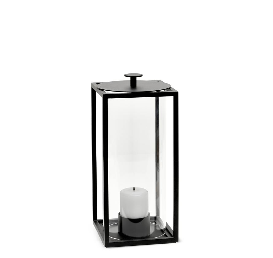 Kubus-serien har fået tilføjet en elegant lanterne, der er designet af Morgens Lassens barnebarn, Søren Lassen. Lanternens design er stilren og passer derfor nemt ind i eksisterende indretninger. Lanternen kan bruges til at skabe en hyggelig atmosfære både udenfor i haven, eller på altanen, men også indenfor i hjemmet. Lanternen har et låg, som sikrer at lyset ikke blæser ud på vindfulde dage og det smukke, runde glasindsats kan benyttes med levende fyrfadslys eller bloklys, men du kan også vælge at benytte et miljøvenligt LED-lys. Lanternen har en højde på 20 cm og er lavet af sort pulverlakeret metal.