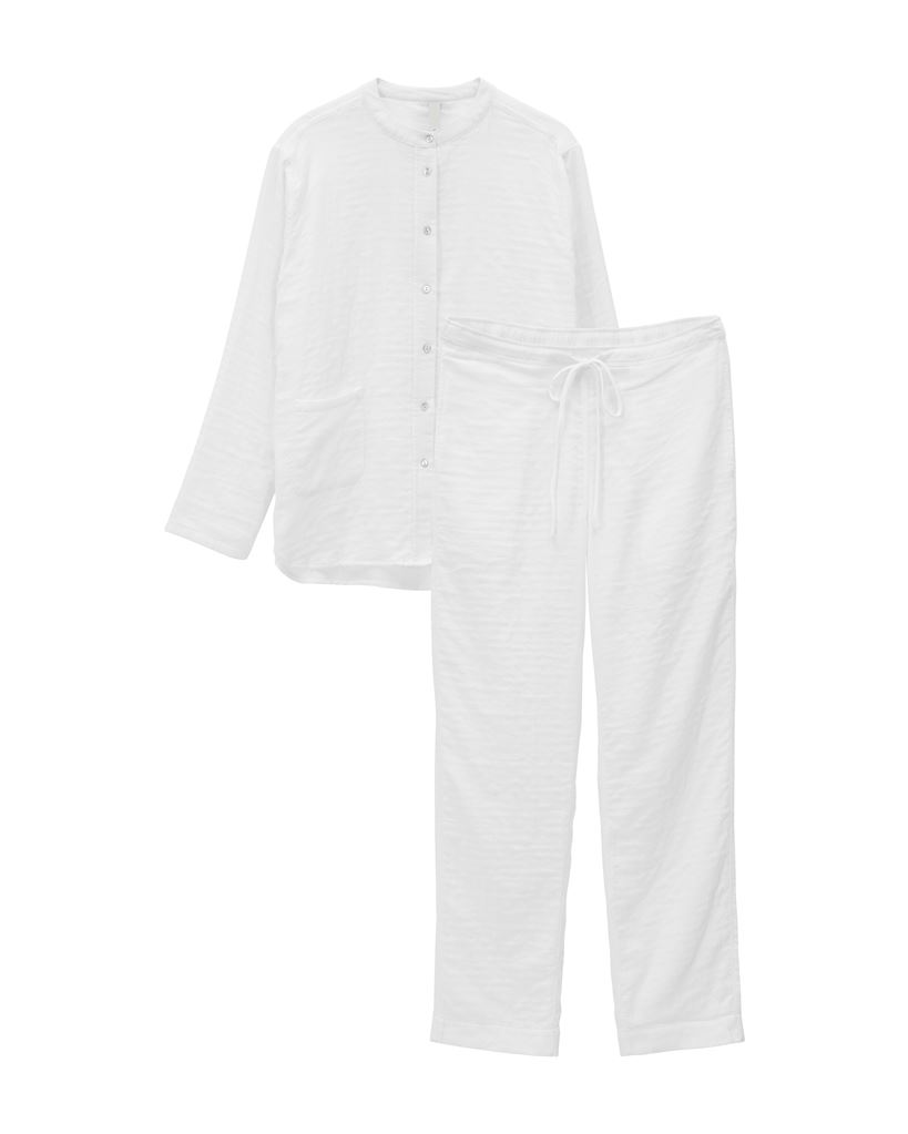 Gå aftenen i møde med komfortable lette og lækre pyjamas sæt fra By Nord. Sættet er skabt af dobbeltsidet bomuld som giver et lidt krøllet udseende og dets bløde overflade. Bukserne har elastik i taljen og toppen har knapper samt to lommer på forsiden. Stoffets lyse nuance skaber ro og er rart for øjet at se på.