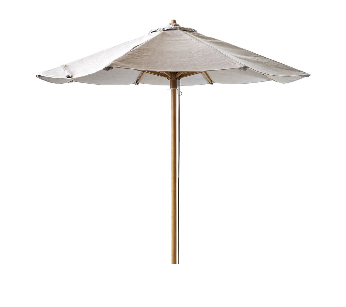 Skøn og klassisk parasol fra Cane-line. Parasollen er designet med henblik på at skabe et produkt der er tidsløst, klassisk og moderne på samme tid. Med denne parasol kan du på meget fin vis afskærme dig fra solen og nyde de varme sommerdage. Parasollens fine farve og varme fra teaktræet, står yderst fint når solens stråler rammer parasollen. Parasollen er udstyret med snoretræk og er vandafvisende. Derudover er det aftagelige stof vaskbart. Parasollen er UV- resistent og og udarbejdet i slidstærkt, samt vejrbestandigt materiale.