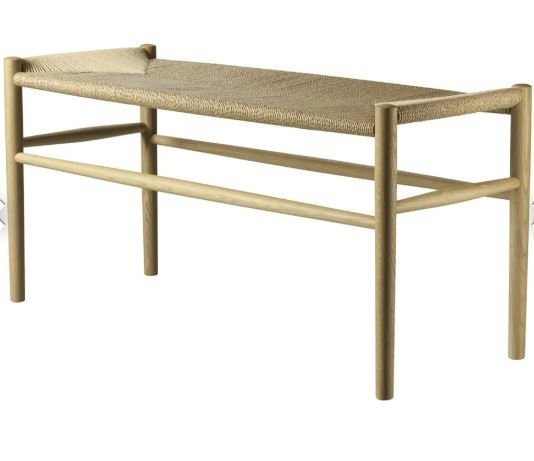Bænken er i massiv eg med et håndflettet sæde. Det benyttede træ er FSC-certificeret og fra europæiske skove.