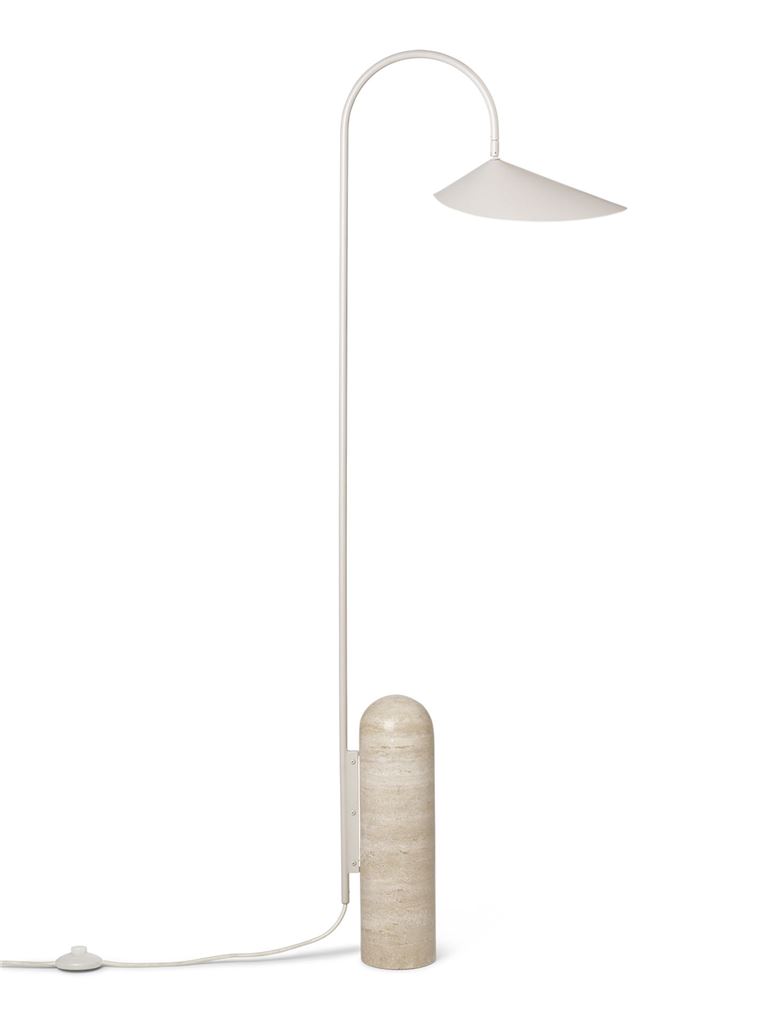 Den elegante Arum lampe fra Ferm Living har en solid og smukt formet marmorfod, der bærer lampens metalkonstruktion og den organiske lampeskærm. Lampeskærmens inderside er cremefarvet, for at opnå et blidt reflekterende lys, der kan justeres ved at tippe skærmen. Brug gulvlampen ved siden af sofaen, hvor den giver blid hyggebelysning eller læselys uden at dominere indretningen. Marmor er et naturmateriale, den præcise farve og mønster varierer fra lampe til lampe.