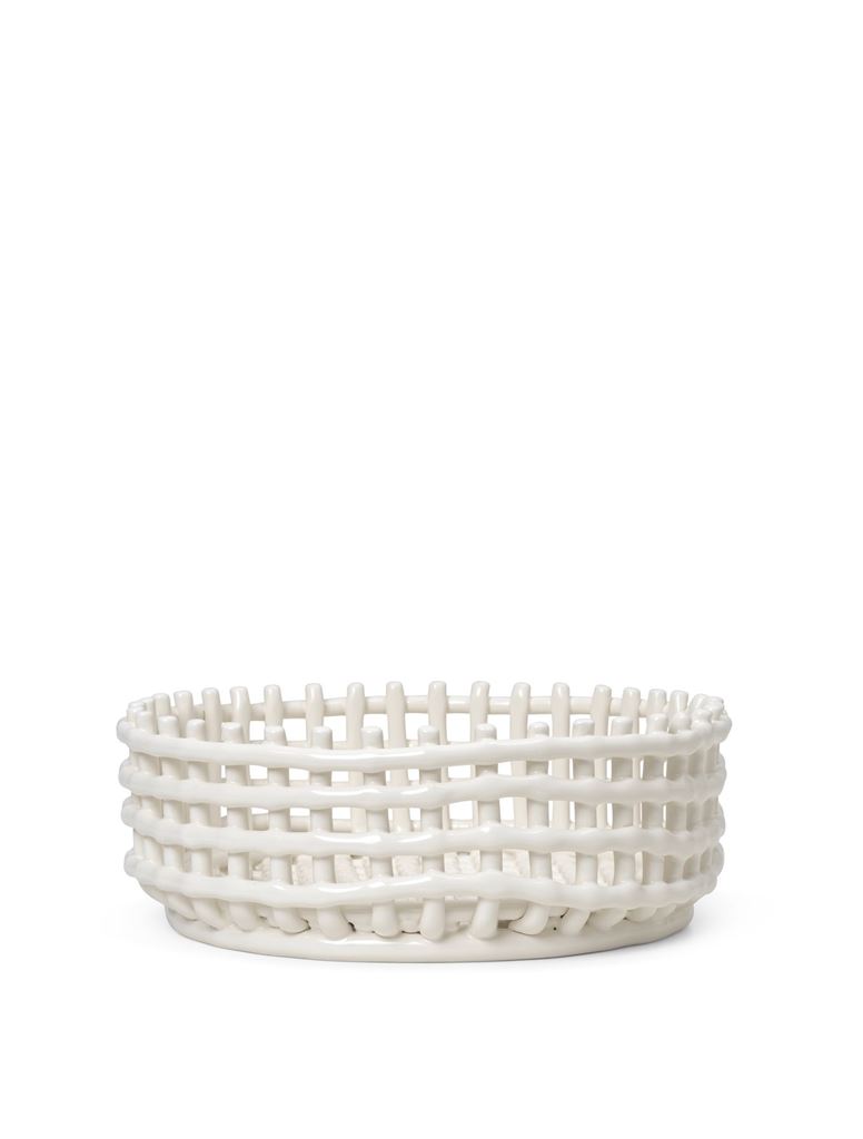 Smuk kurv fra Ferm Living. I Ceramic Centrepiece-serien forenes de traditionelle kurvfletningstekniker med keramik. Et design der er inspireret af de velkendte fletkurve. Denne kurv er ideel til brug, som frugt-, brødkurv eller som et smukt blikfang på ethvert bord. Da kurvene er håndlavede er deres smukke og uregelmæssige former helt unikke, hvilket gør at der er ikke to kurve, som er helt ens.