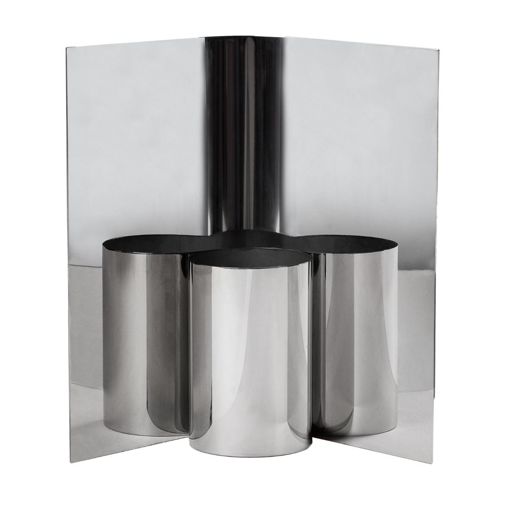 Eddy Vasen er lavet af spejlpoleret rustfrit stål, der skaber fascinerende refleksioner og forstærker dens visuelle tiltrækningskraft. Med sin moderne, minimalistiske æstetik og sit dristige design består vasen af et slankt cylindrisk rør omgivet af en koncentrisk bøjet plade, der strækker sig ud over vasens højde. Den unikke form fremhæver buketten indeni og gør vasen til et iøjnefaldende midtpunkt, der bringer elegance og atmosfære til ethvert rum.