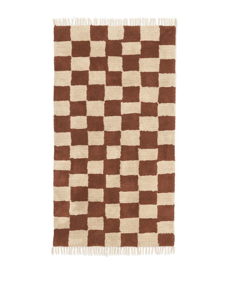 Det praktiske Mara tæppe fra Ferm Living er perfekt til børneværelset. Tæppet har et legende udtryk med sit ternede mønster og dekorative frynser. Skulle børnene tabe væsker eller andet på tæppet er det ingen problem, da Mara tåler maskinvask på 30°C skånevask.