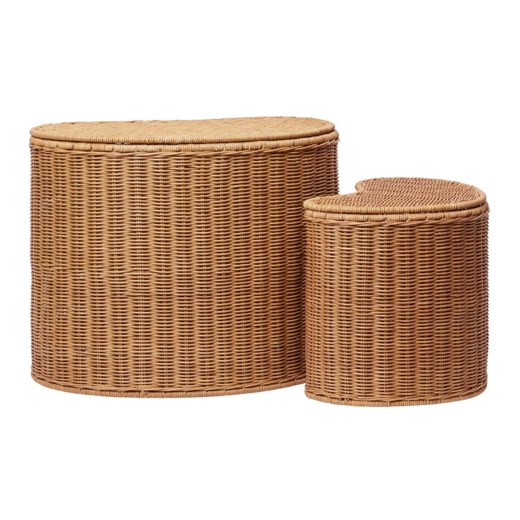 Willora flettet opbevaring tilfører varme og en legende stemning til børneværelset. De to kurve er organisk formede, håndflettet i rattan og understøttet af en robust jernramme. Når de ikke er i brug, kan den mindste kurv nemt gemmes i den største. Perfekte til opbevaring af legetøj, bøger eller kreative materialer – og samtidig smukke nok til at fungere som dekorative sideborde i både legeværelse og soveværelse