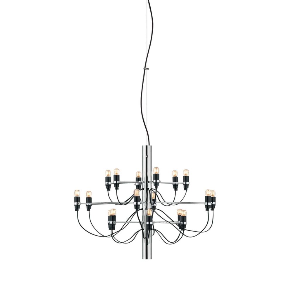 Elegant lysekrone med 18 arme i krom fra FLOS. Lysekronen er optimal til større rum som for eksempel store entreer, spisestuer eller festsale. Lampen har en utrolig flot udstråling og giver et næsten majestætisk udtryk, når den er tændt. Lampen har en 2,8 meter lang sort ledning, 20 LED lyskilder medfølger.