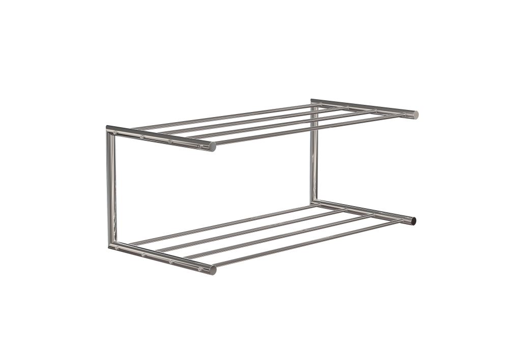 Elegant dobbelt skohylde fra FROST. Skohylden har en længde på i alt 61,9 cm, og måler 60 cm mellem skuehullernes midtpunkter. Skohylden er lavet i rustfrit stål og har et børstet finish. Hylden er en del af NOVA serien, bestående af tilbehør til garderobe, badeværelse og køkken. Brug skohylden i gangen, entréen eller måske soveværelset. Fødder til skohylden kan tilkøbes.
