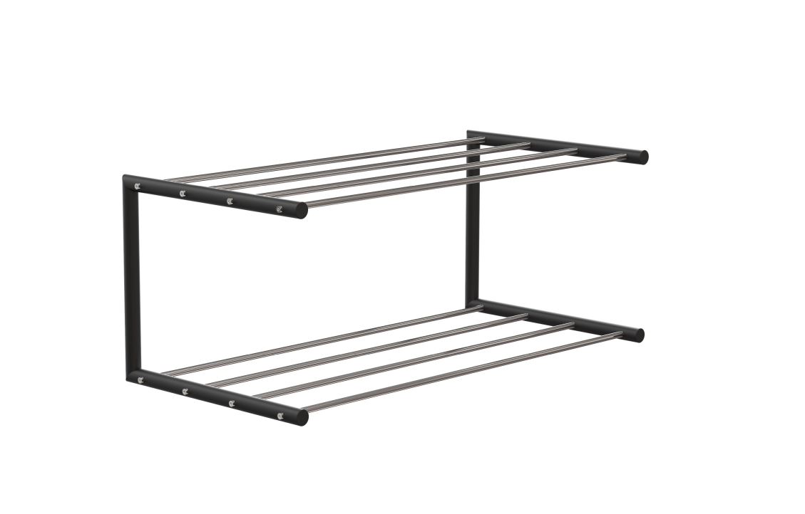 Elegant dobbelt skohylde fra FROST. Skohylden har en længde på i alt 61,9 cm, og måler 60 cm mellem skuehullernes midtpunkter. Skohylden er lavet i rustfrit stål og har et mat poleret og sort finish. Hylden er en del af NOVA serien, bestående af tilbehør til garderobe, badeværelse og køkken. Brug skohylden i gangen, entréen eller måske soveværelset. Fødder til skohylden kan tilkøbes.