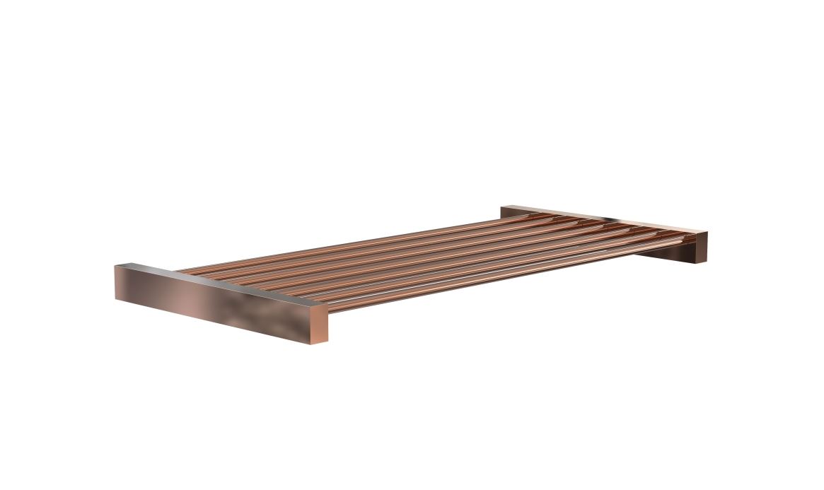 Flot QUADRA hylde fra FROST. Hylden har en længde på 60 cm, er lavet i rustfrit stål og har en flot poleret kobber finish. Hæng hylden på badeværelset og få plads til ekstra skønhedsprodukter, håndklæder eller andet. QUADRA består af tilbehør til bad, køkken og garderobe og kan kombineres på kryds og tværs lige efter dit behov, og så sørger hyldens tidløse og elegante design for, at den passer ind i de fleste eksisterende indretninger. Så ønsker du et frisk pust til indretningen på badeværelset er QUADRA perfekt.