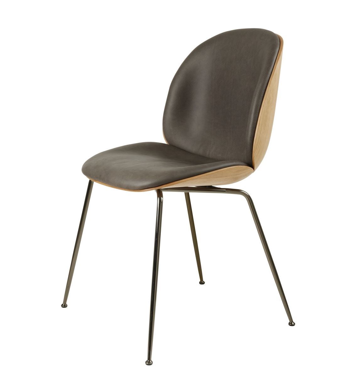 GUBI Beetle Dining Chair Conic Base SH: 43,5 cm - Black Chrome Base/Veneer Shell/Soft Leather Gray