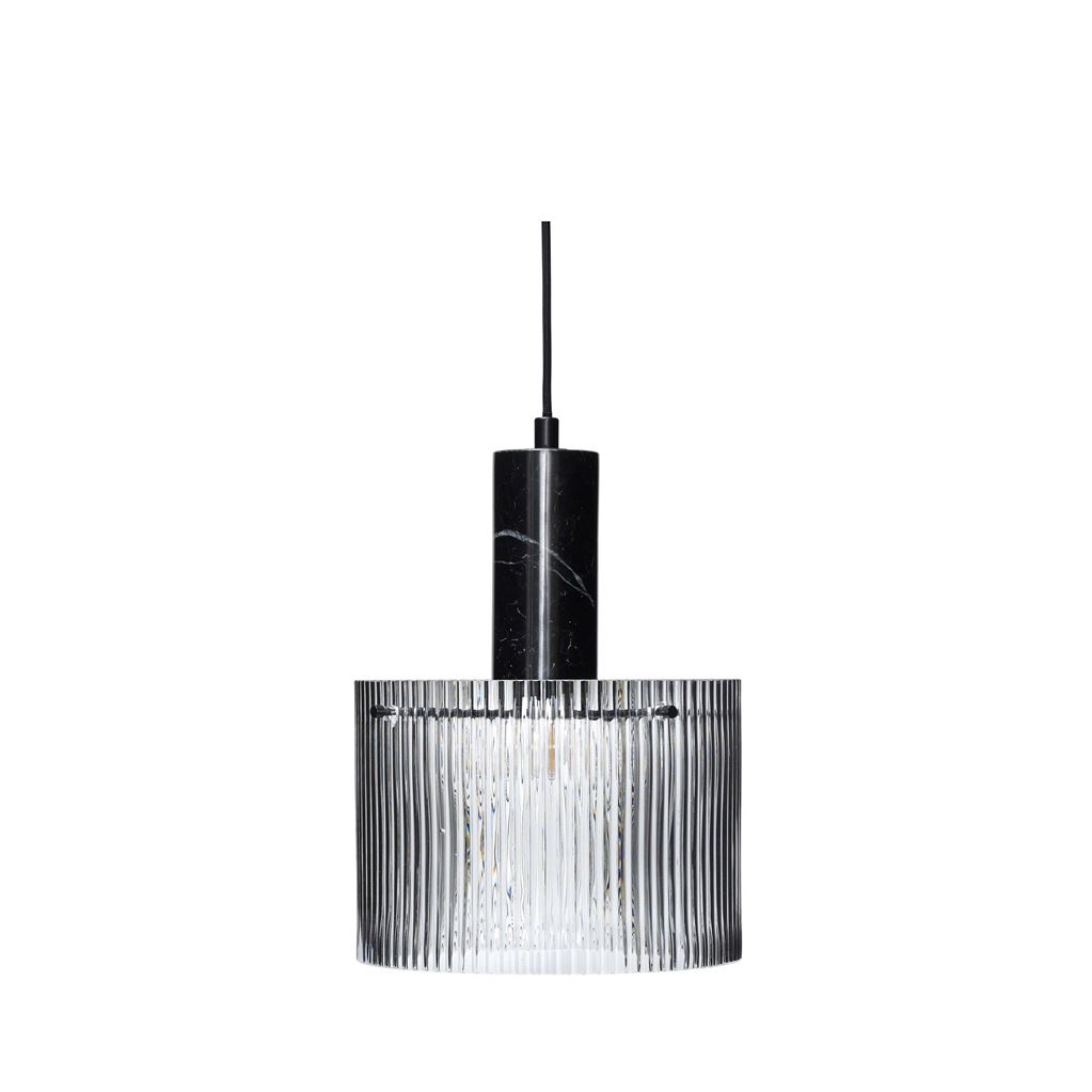 Oplys dit hjem med denne smukke loftlampe fra Hübsch. Loftlampens skærm er udformet i glas, hvilket giver lampen et let og feminint ydre. Det rillede mønster fremkalder en elegant og flot belysning i rummet. Lampen har en marmor top der giver lampen et eksklusivt og klassisk udtryk. Lampen vil klæde de fleste indretninger og være ideel over spisebordet. Placer gerne flere af lamperne sammen, for at opnå den ønskede belysning. Marmor er et naturmateriale, den præcise farve og mønster vil derfor variere fra produkt til produkt.