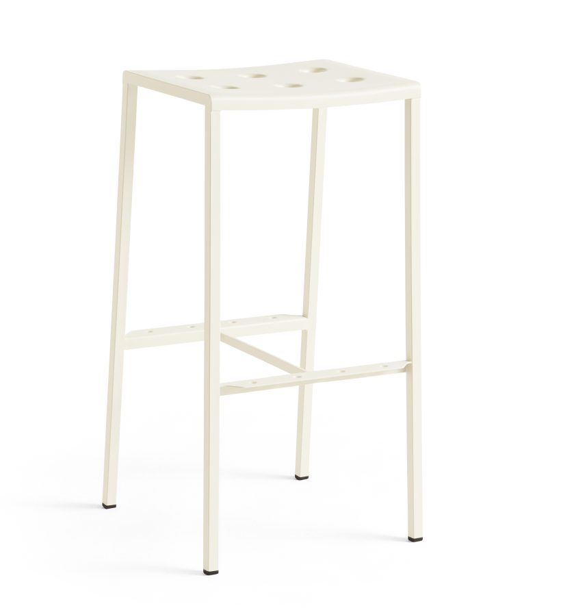 HAY Balcony Bar Stool er designet af Ronan og Erwan Bouroullec og er en funktionel barstol til udendørs brug. Balcony serien forener et rektangulært design med bløde, imødekommende former og slanke ben. Hullerne i sædet styrker konstruktionen samtidigt med, at den skaber et særligt udtryk. Balcony Bar Stool er lavet i pulverlakeret stål med en udendørs primer for optimal holdbarhed. Bar Stool kommer i forskellige farver, hvilket gør den egnet til en bred række indretninger, og kan bruges til indretning af alt fra udendørs områder til altaner.