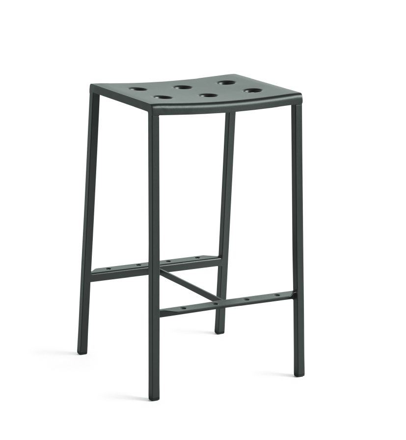 HAY Balcony Bar Stool er designet af Ronan og Erwan Bouroullec og er en funktionel barstol til udendørs brug. Balcony serien forener et rektangulært design med bløde, imødekommende former og slanke ben. Hullerne i sædet styrker konstruktionen samtidigt med, at den skaber et særligt udtryk. Balcony Bar Stool er lavet i pulverlakeret stål med en udendørs primer for optimal holdbarhed. Bar Stool kommer i forskellige farver, hvilket gør den egnet til en bred række indretninger, og kan bruges til indretning af alt fra udendørs områder til altaner.
