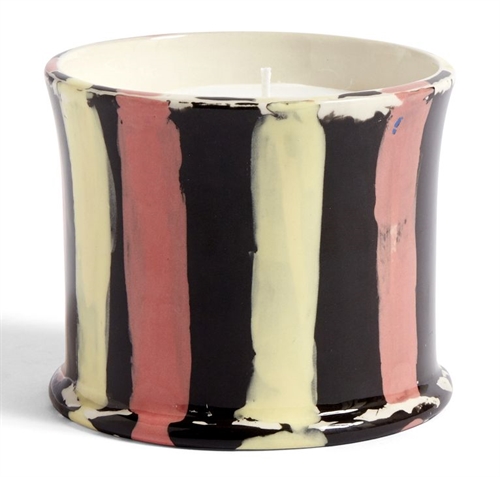 Det smukke Stripe lys fra HAY består af en håndmalet beholder, der er lavet af stentøj. Stentøjet indeholder et stearinlys med en skøn duft af orange. Det farverige mønster på beholderen gør at lysene kan bruges dekorativt når stearinlyset er brændt ned.